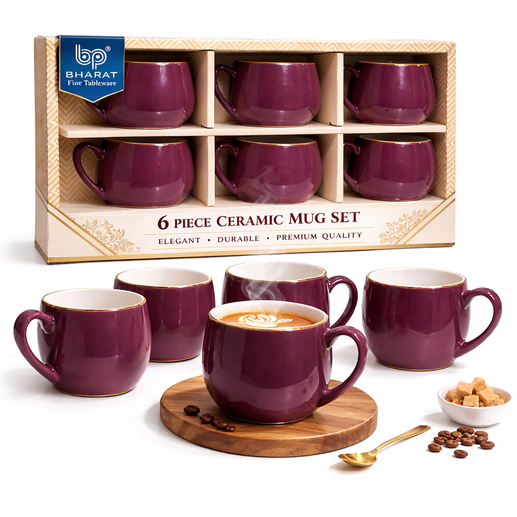 Enhance your tea and coffee experience with this elegant Bharat Fine Tableware Purple Ceramic Mug Set. Designed with a rich glossy finish and premium gold-rim detailing, these mugs bring a touch of luxury to your daily routine. Crafted from high-quality ceramic, they offer excellent durability, heat retention, and a comfortable grip.